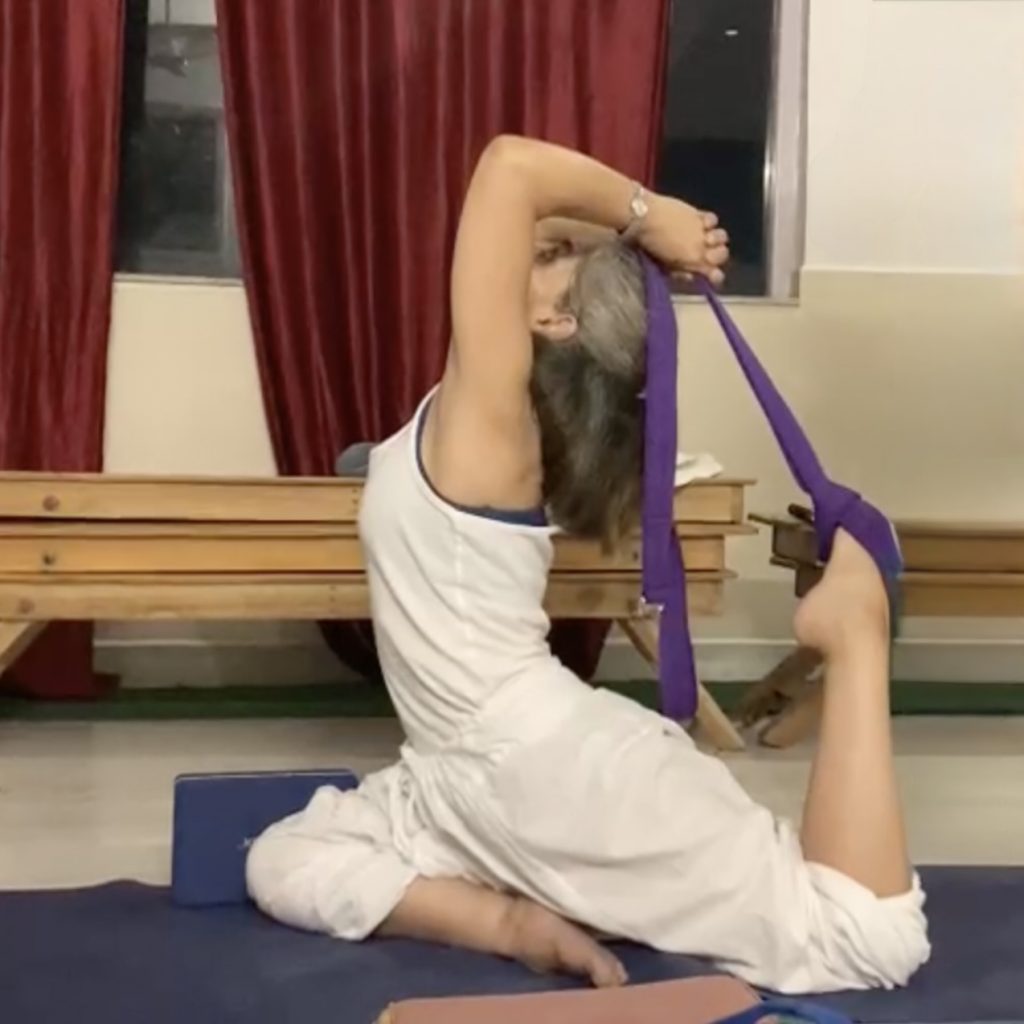 Par exemple, dans Eka Pada Rajakapotasana (la posture du roi pigeon), je ne peux pas attraper mes pieds avec mes mains lors du backbend. J’utilise donc une sangle pour relier mes mains aux pieds. Cela me permet de profiter de l’ouverture des hanches, et de l’extension de la colonne, sans forcer ni me blesser.